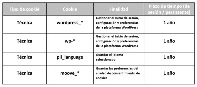 A continuación, procedemos a informarte sobre todos los tipos de cookies que actualmente se utilizan en nuestra página web y la finalidad de cada una de las mismas: